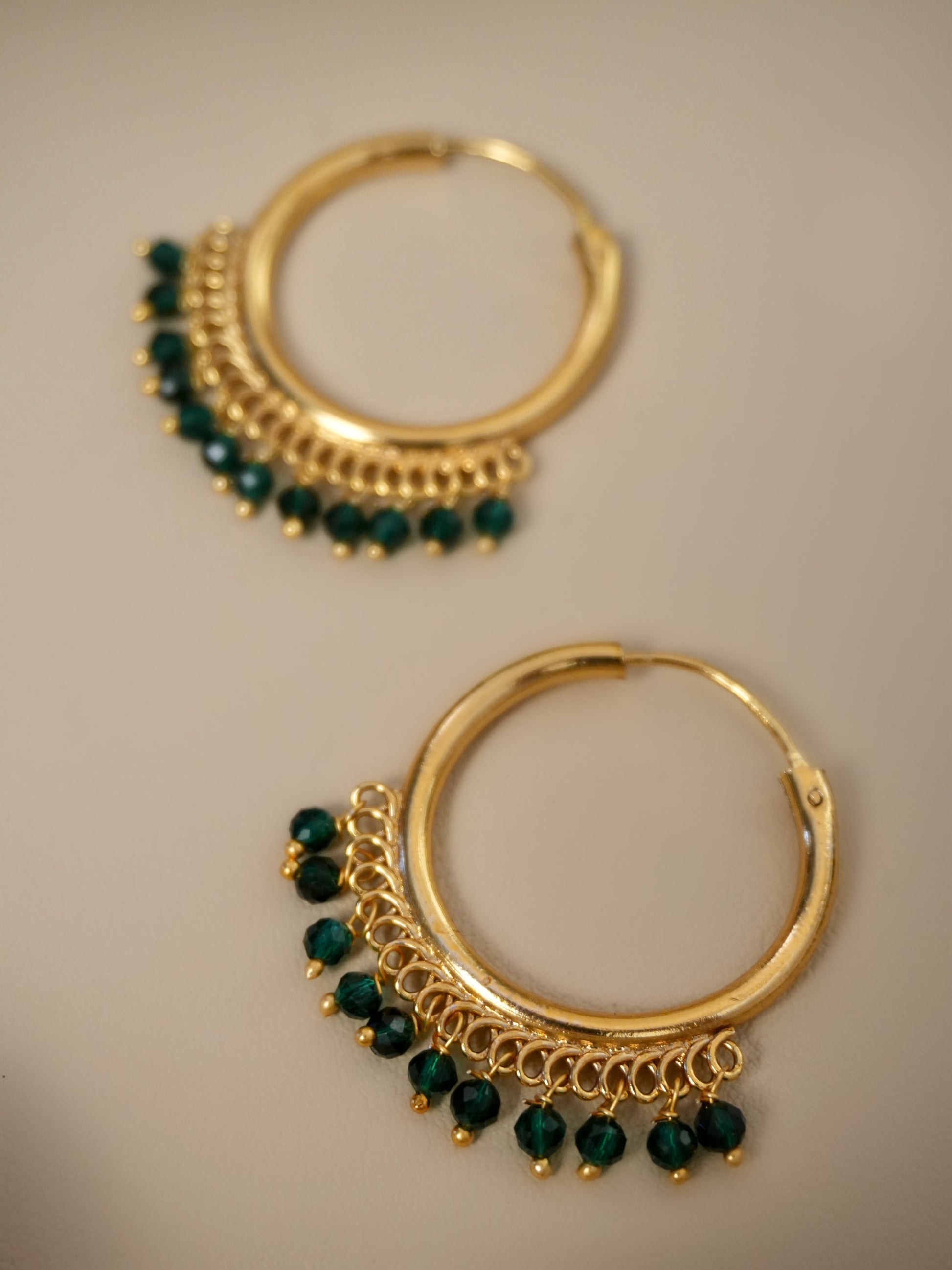 Introducing Adya Hoops - the perfect staple accessory for any outfit! With its simple gold hoops adorned with emerald green beads, these hoops add a touch of fun and versatility. From a casual day out in jeans & kurti to a boho chic look with a skirt and crop top, Adya Hoops are a must-have!