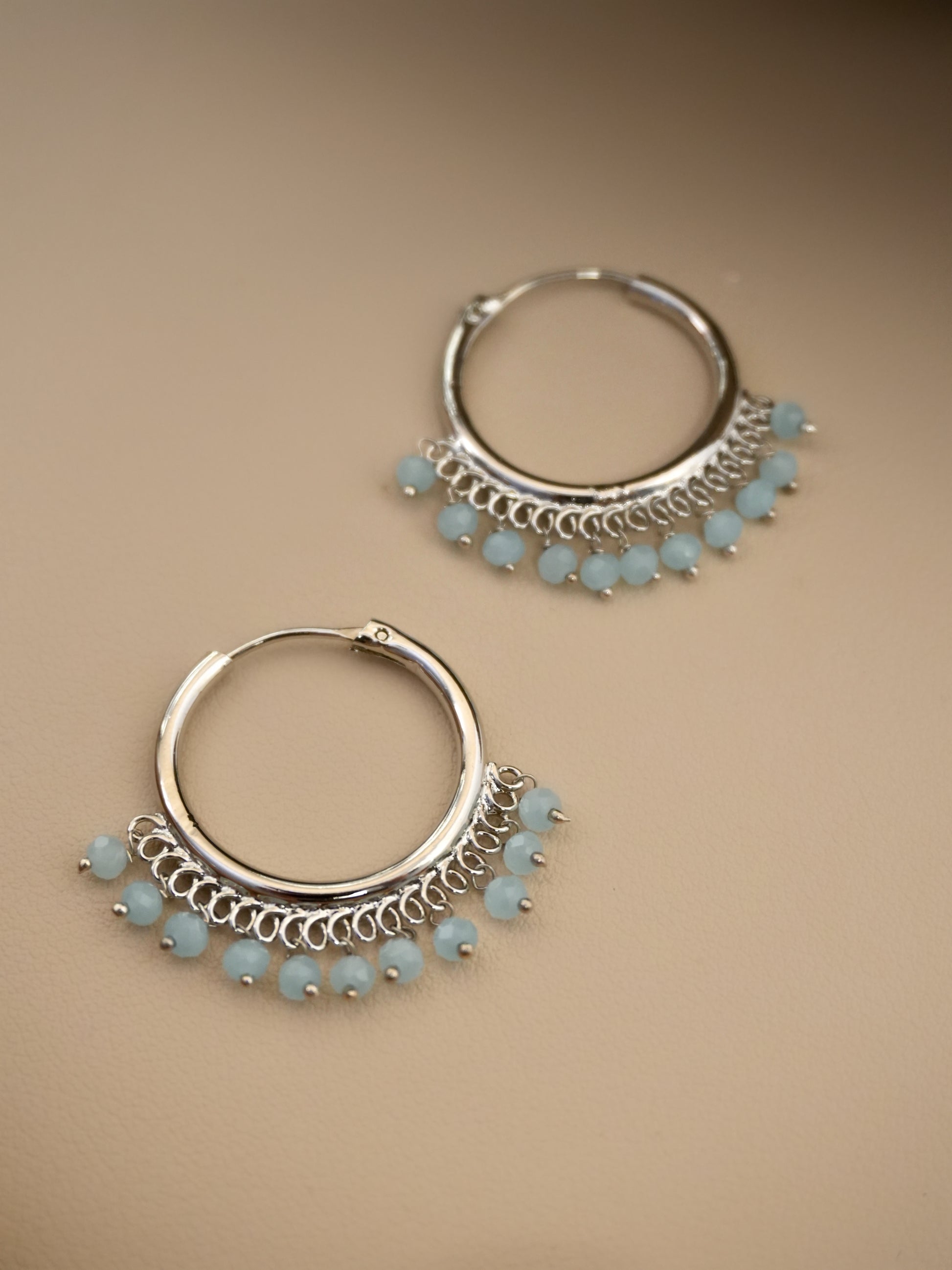 Introducing Adya Hoops - the perfect staple accessory for any outfit! With its simple silver hoops adorned with soft powder blue beads, these hoops add a touch of fun and versatility. From a casual day out in jeans & kurti to a boho chic look with a skirt and crop top, Adya Hoops are a must-have!
