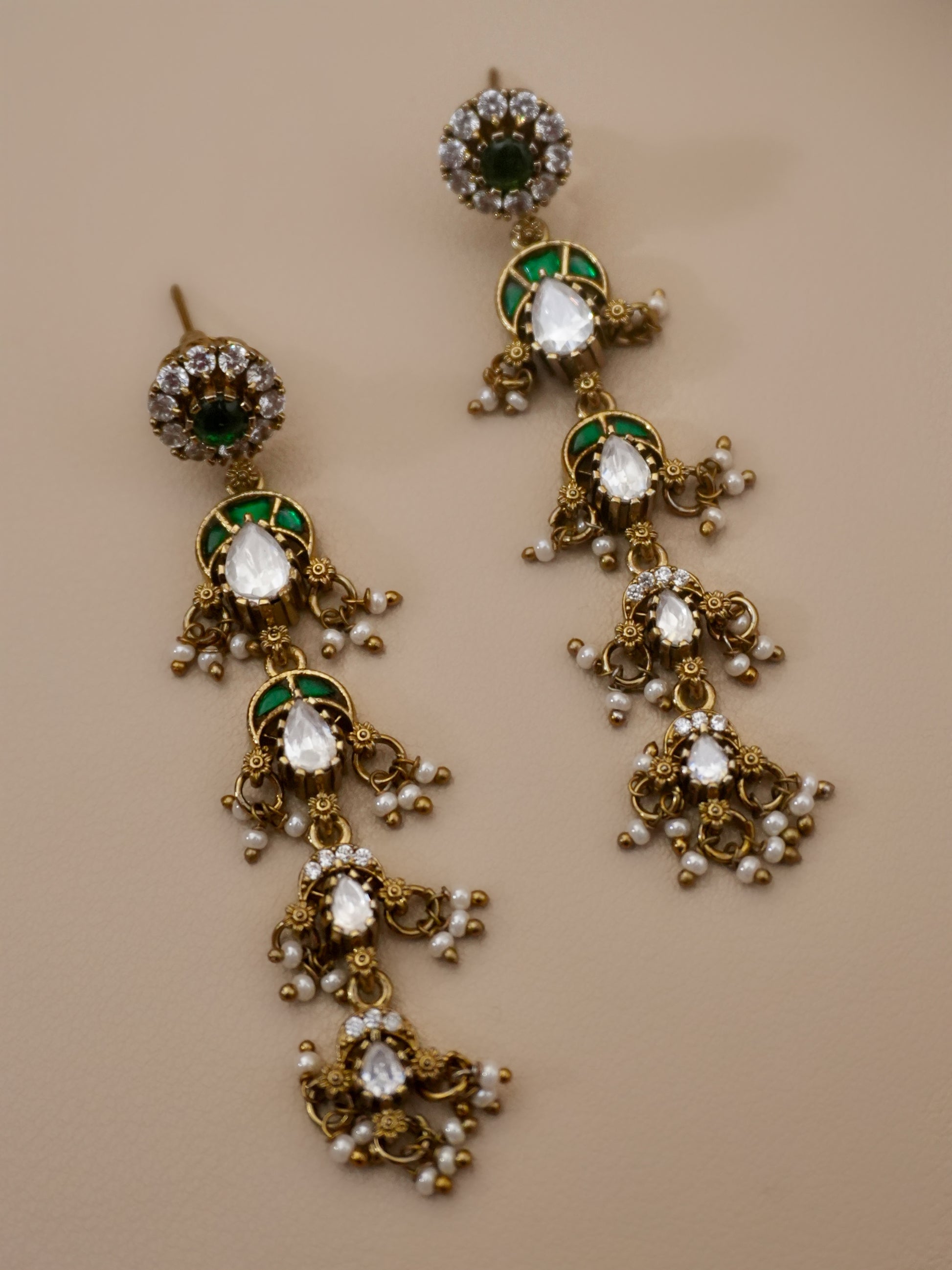 Indulge in the intricate details of Banasri Kundan Earrings featuring an Indo-Victorian style & emerald accents. These stunning earrings exude elegance and stand out with its simple design. Perfect for evening and reception wear, these earrings add a touch of sophistication and glamour to any outfit.