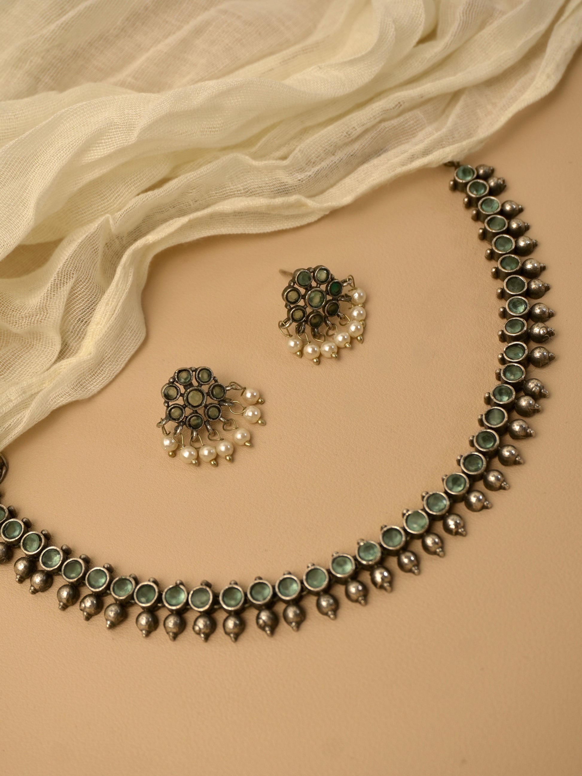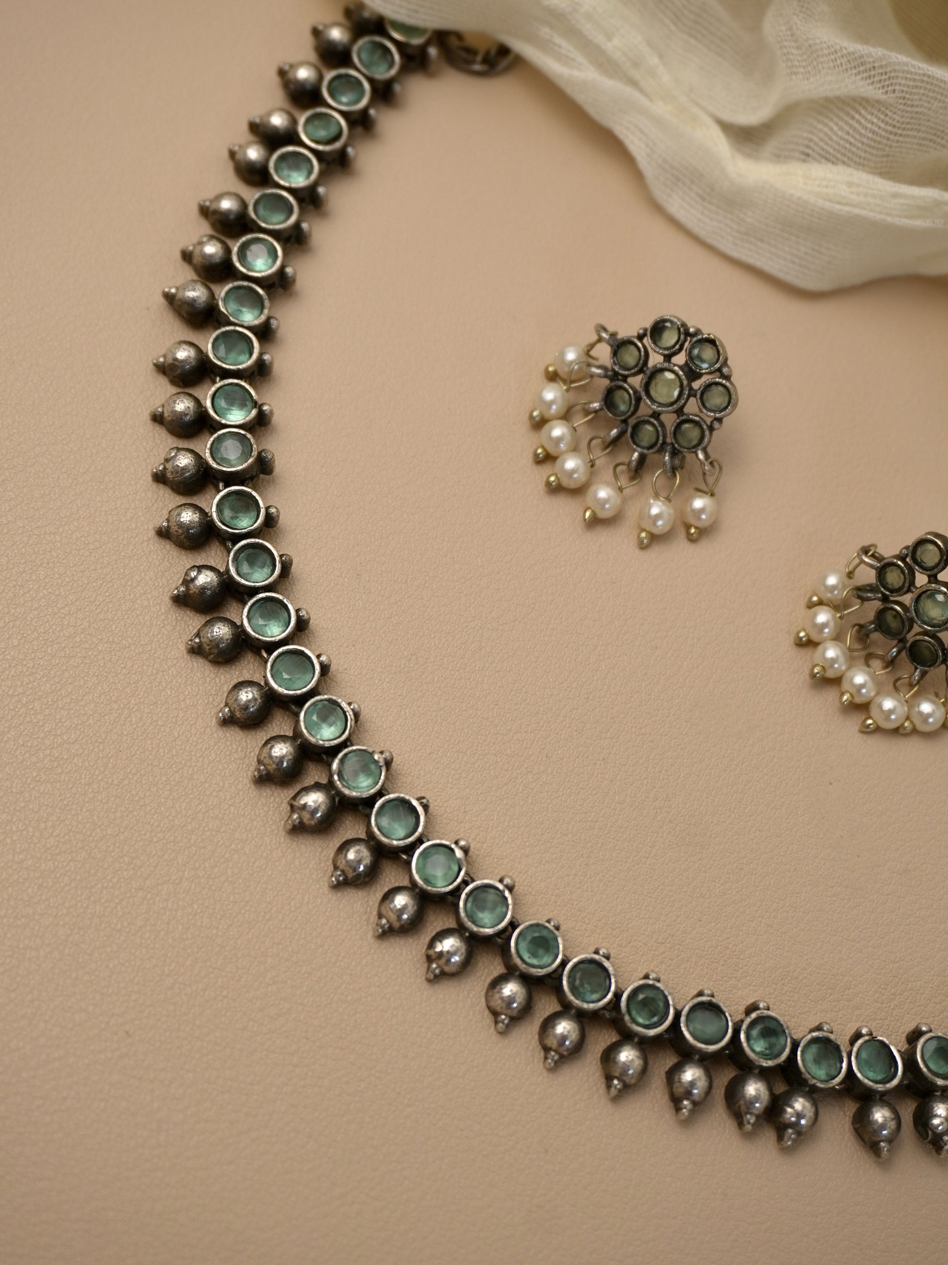The Chaitali Oxidised Necklace Set is made for girls who adore simple statements. This gorgeous set features mint blue stone beads, blending vibrant modern colours with traditional tribal design for a fresh, eye-catching look!