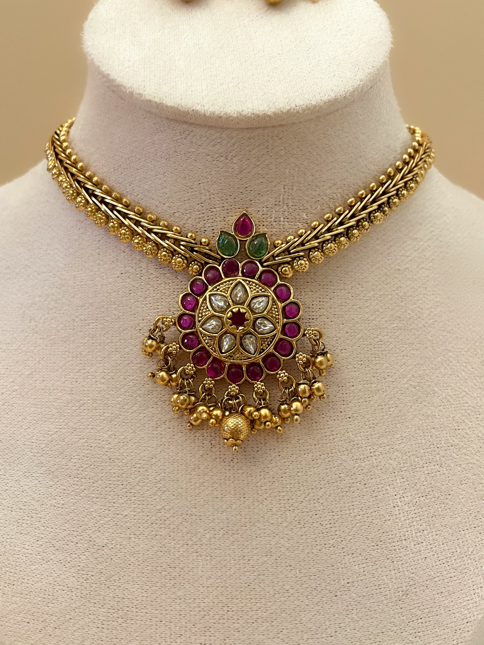 This Chanasya Necklace Set is a stunning piece of jewellery crafted with traditional features offering a touch of vintage charm to your look.