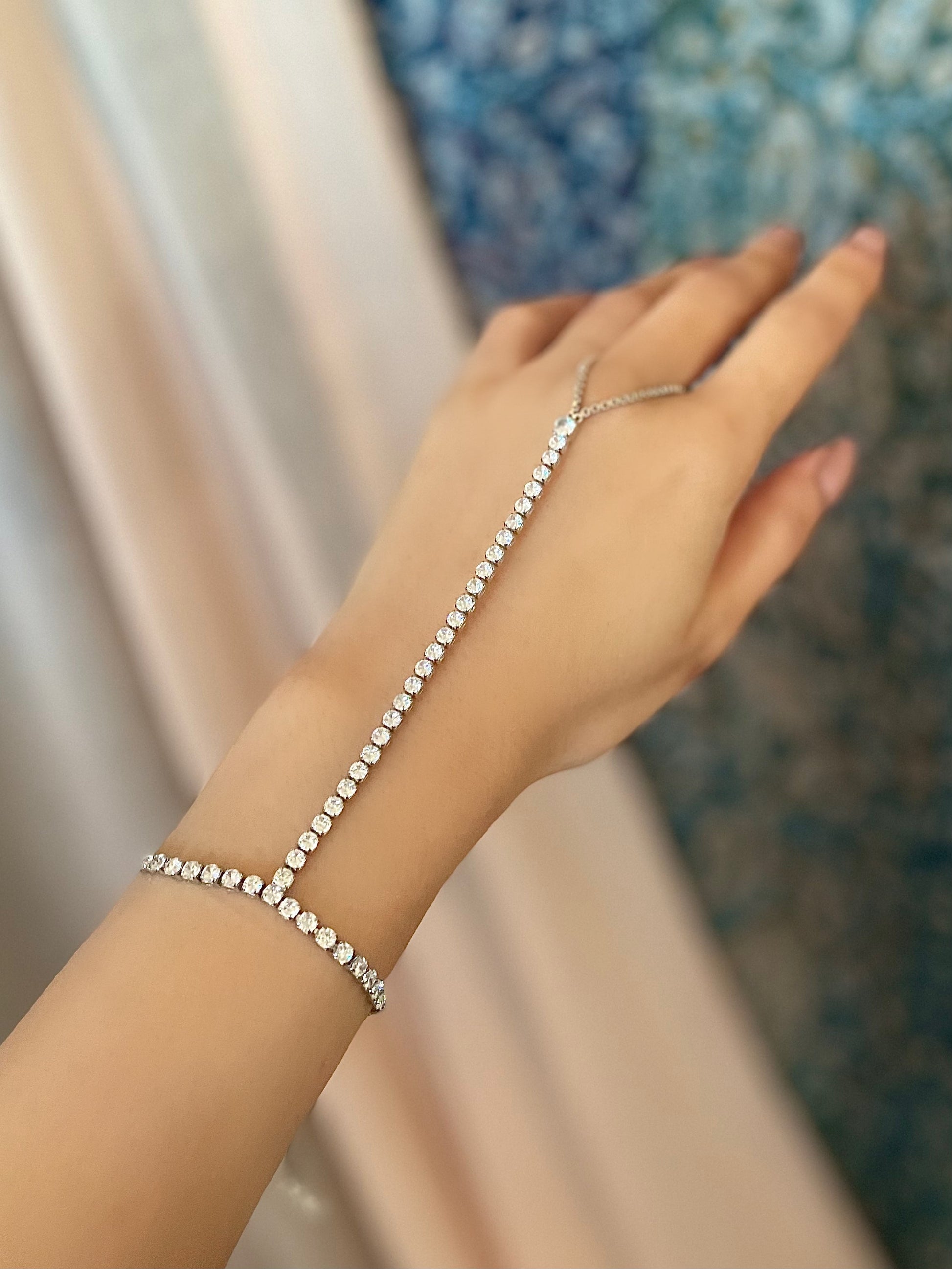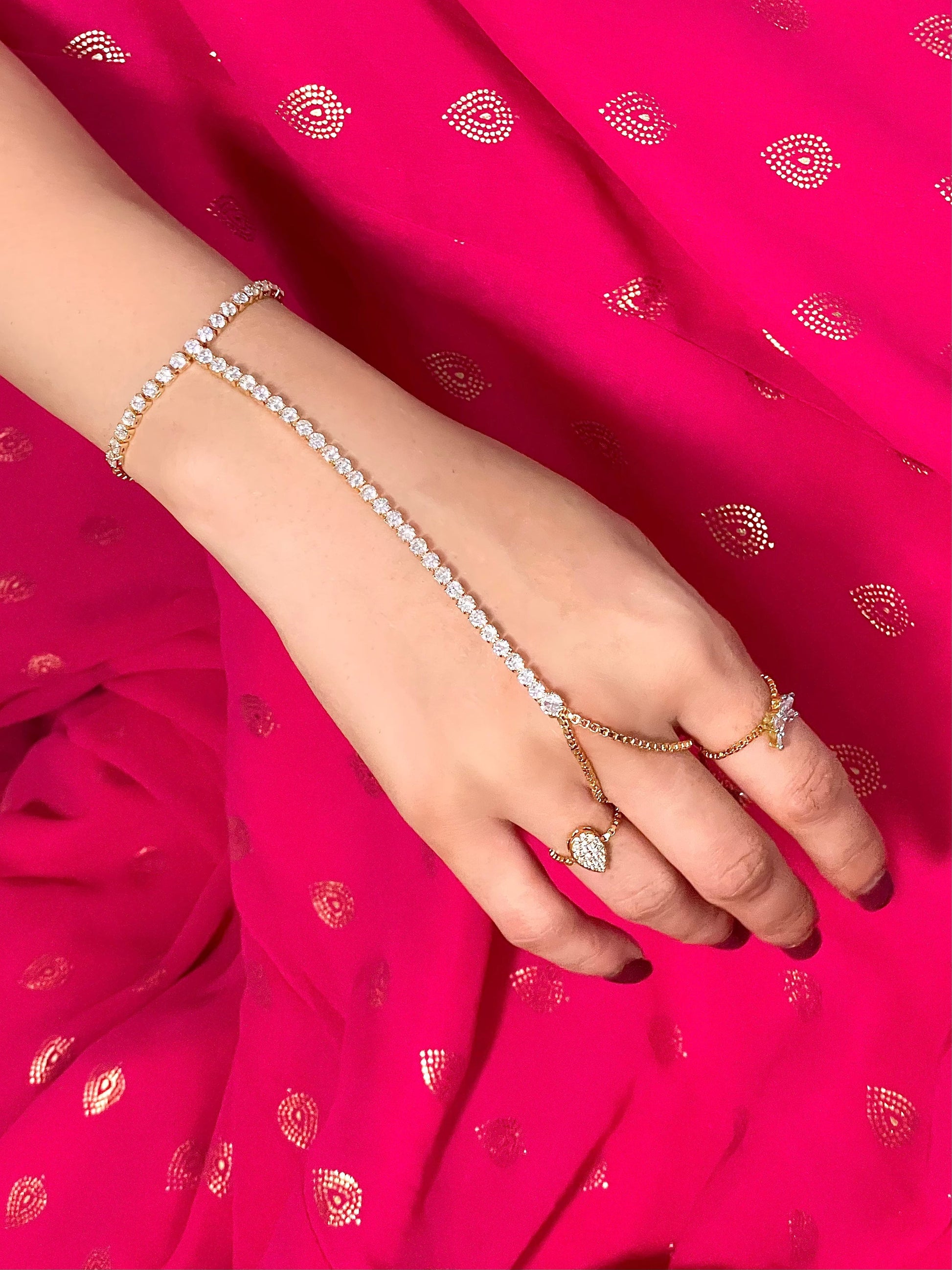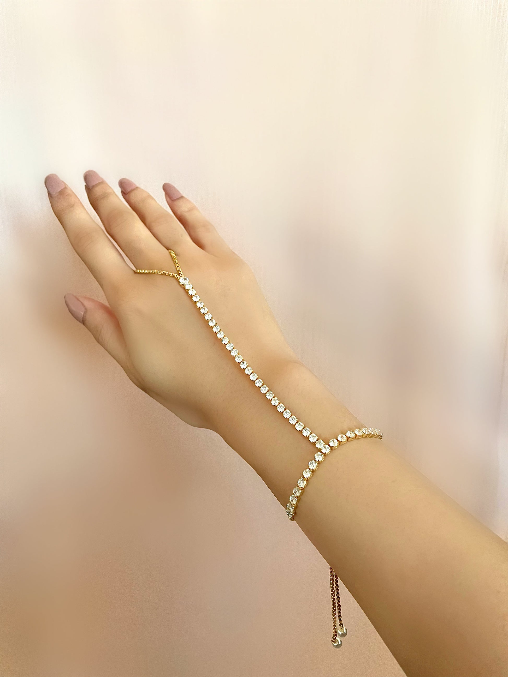 This glimmering gold-plated hand chain sports a delicate, simple and timeless design. Complete with sparkling cubic zirconia stones, it's a one-size-fits-all stunner!