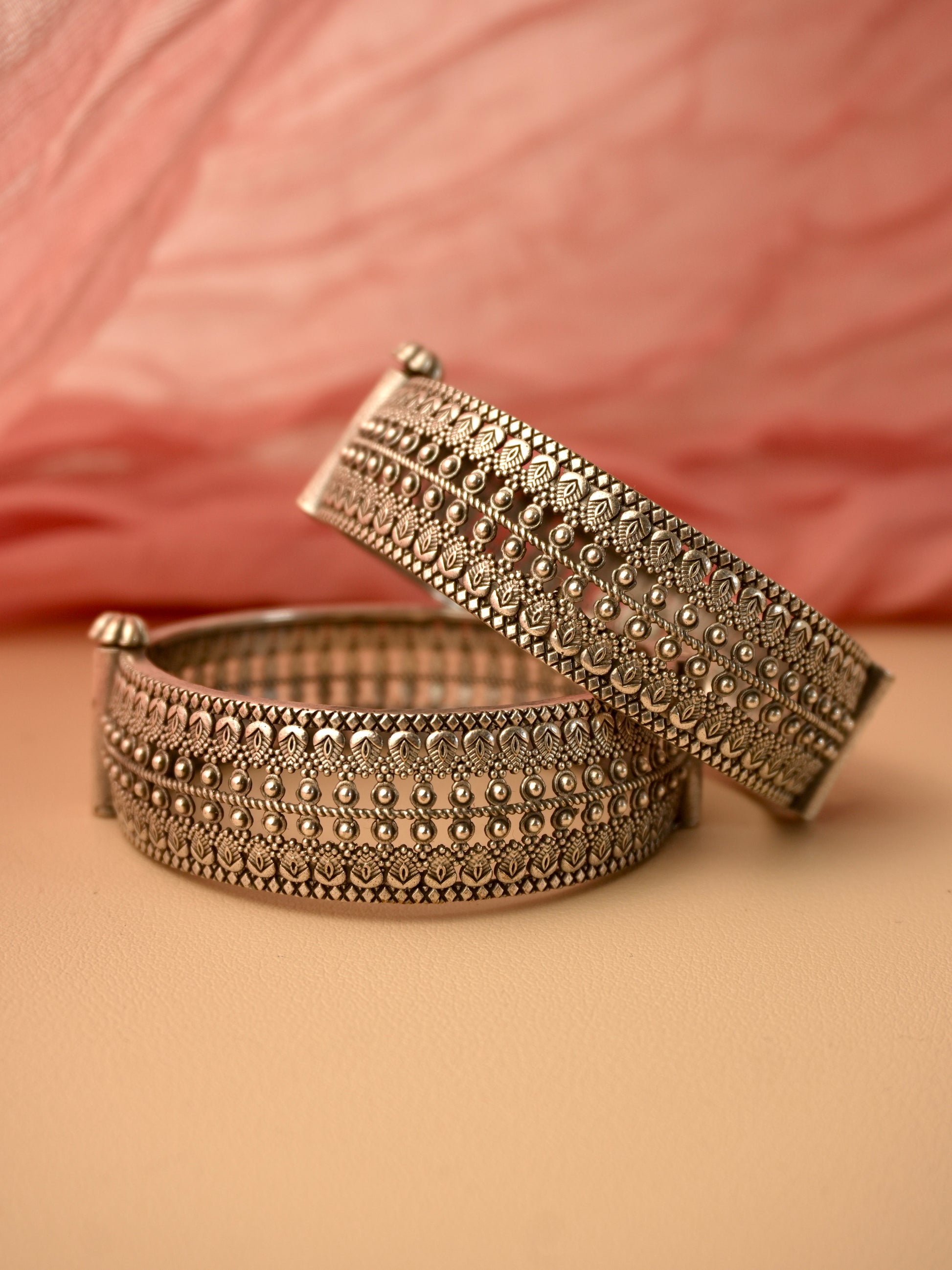 The oxidised finish enhances the artisanal details, making them easy to pair with both traditional and contemporary outfits. These bangles are crafted to transition effortlessly, whether you’re dressing for nine nights of garba or curating everyday looks that carry the same cultural influence.
