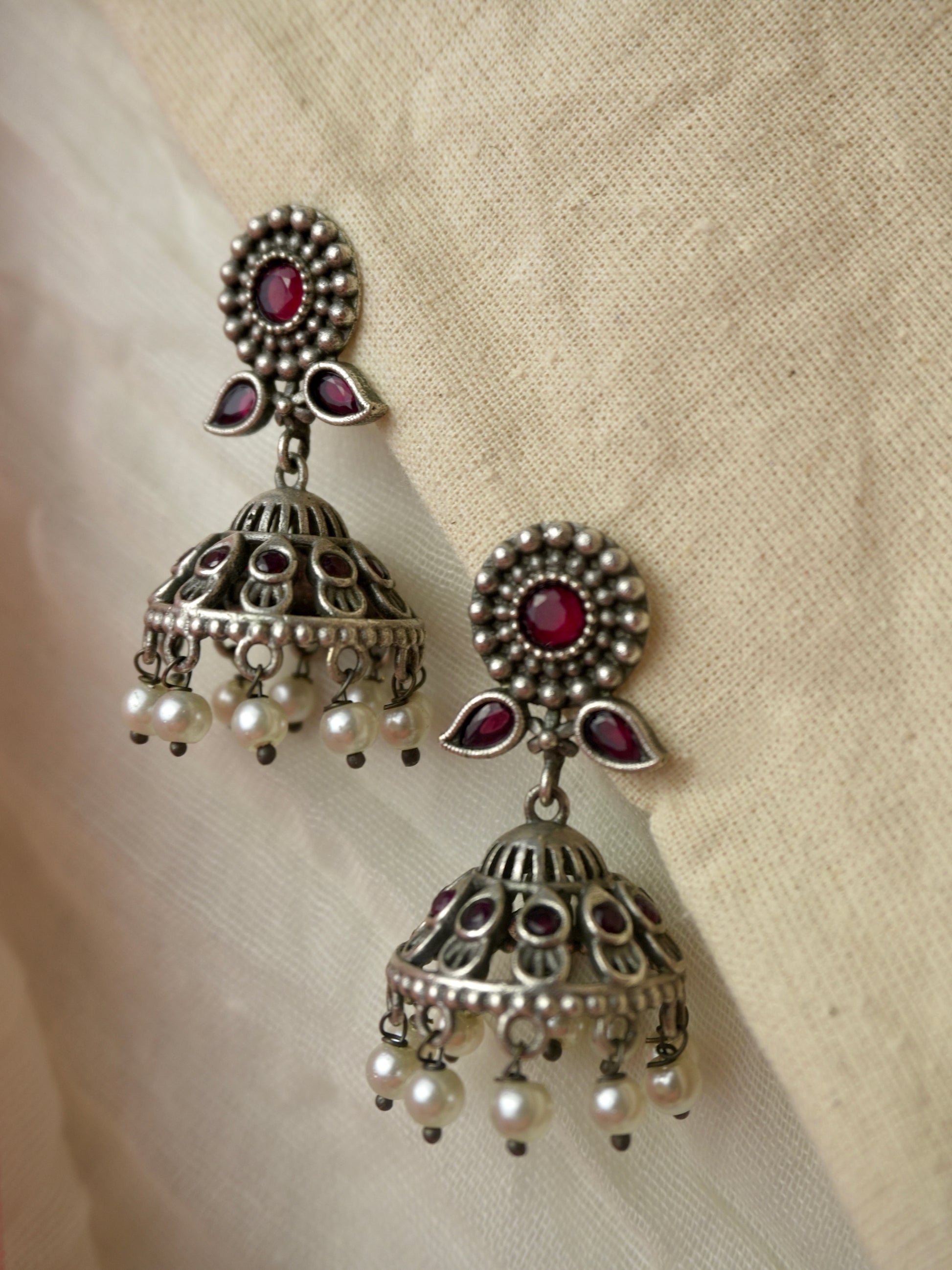 The Diya Oxidised Earrings pair the perfect pop of ruby pink with timeless oxidised silver, creating a look that’s both playful and elegant. These petite jhumkas are ideal if bold isn’t your style, simple, delicate, and adorned with pearls for a subtle sparkle.