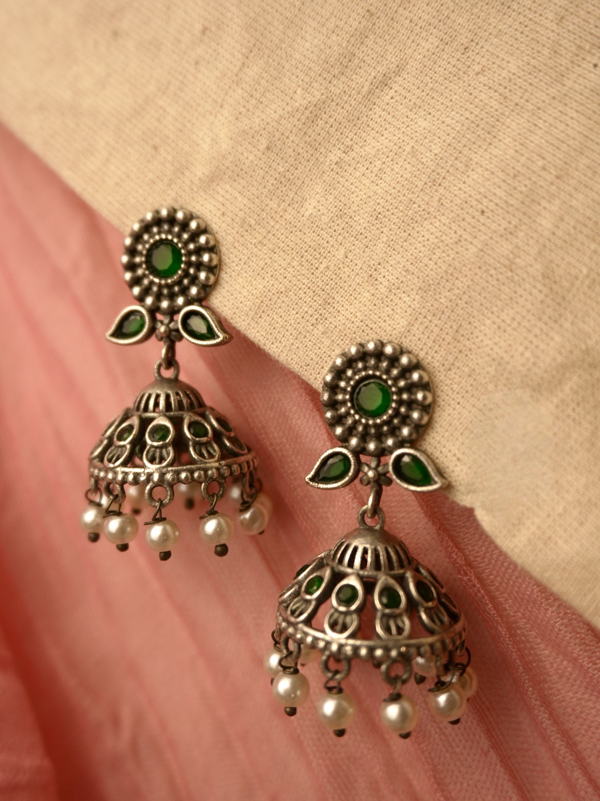 The Diya Oxidised Earrings pair the perfect pop of emerald green with timeless oxidised silver, creating a look that’s both playful and elegant. These petite jhumkas are ideal if bold isn’t your style, simple, delicate, and adorned with pearls for a subtle sparkle.