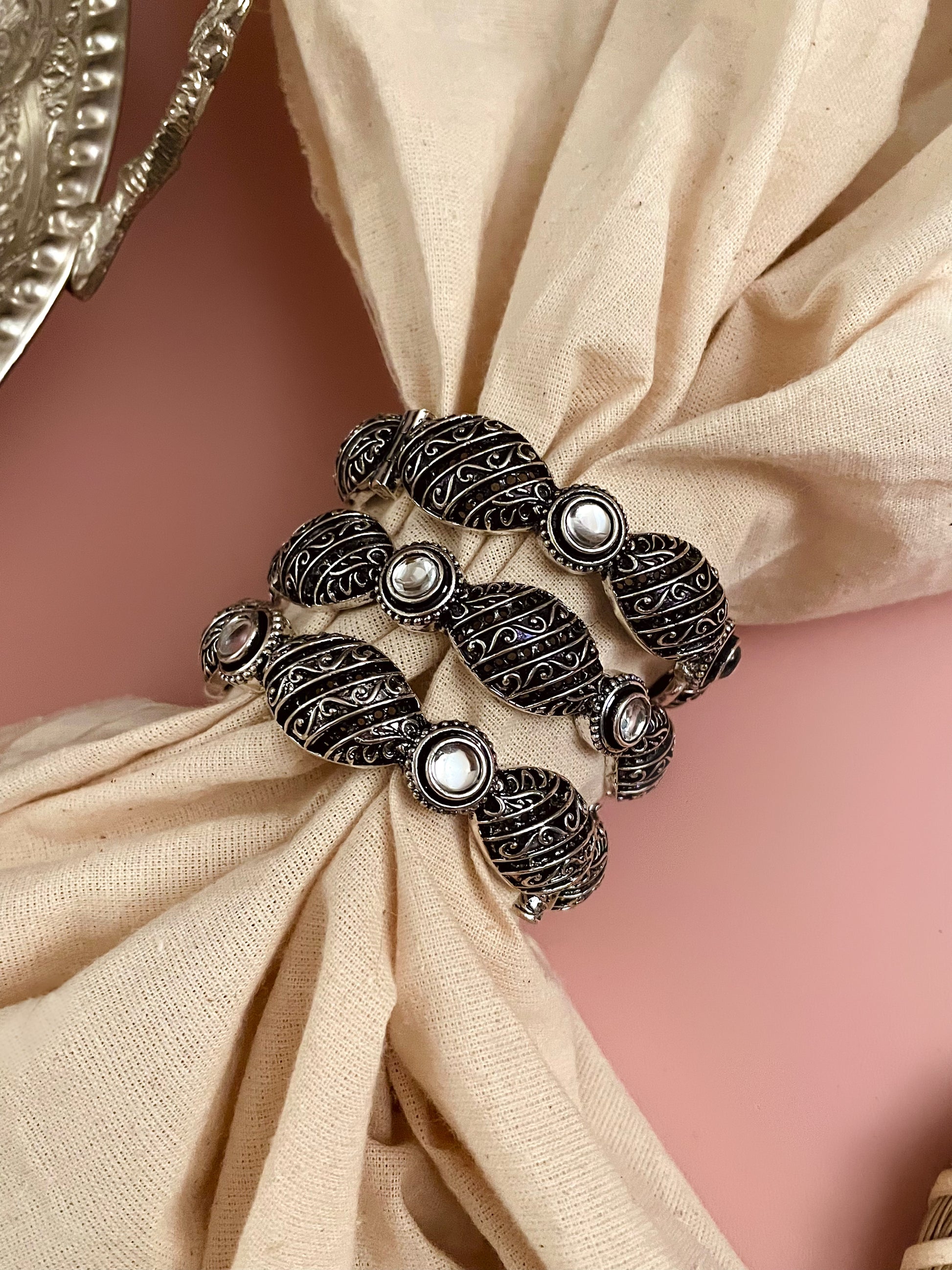 Ganika Oxidised Kada Bangle makes a compelling addition to any oxidised jewellery collection. This openable kada can be worn on its own or used to create stunning stacked combinations for an eye-catching festive look.