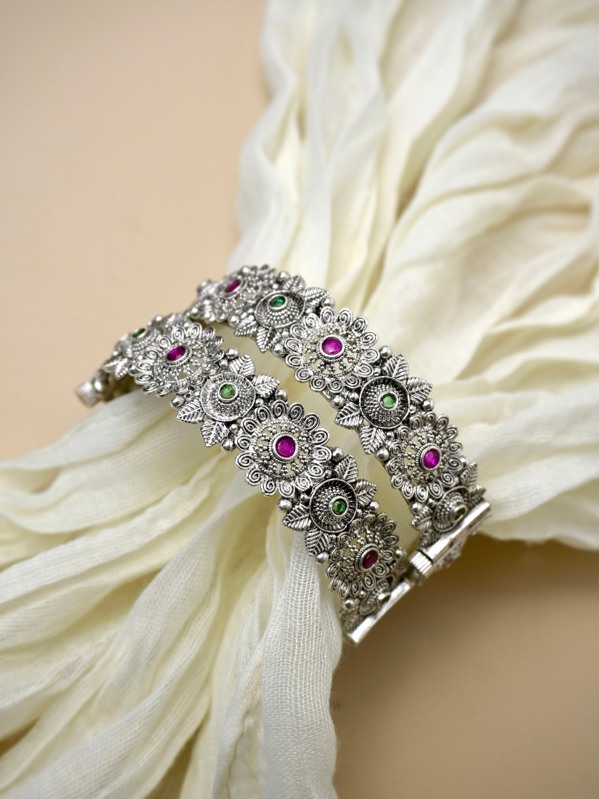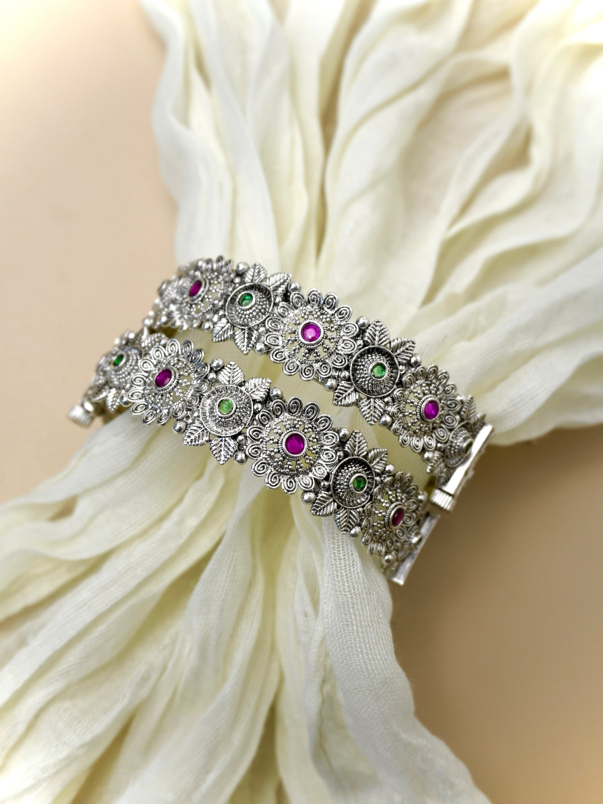 The oxidised finish enhances the artisanal details, making them easy to pair with both traditional and contemporary outfits. These bangles are crafted to transition effortlessly, whether you’re dressing for nine nights of garba or curating everyday looks that carry the same cultural influence.