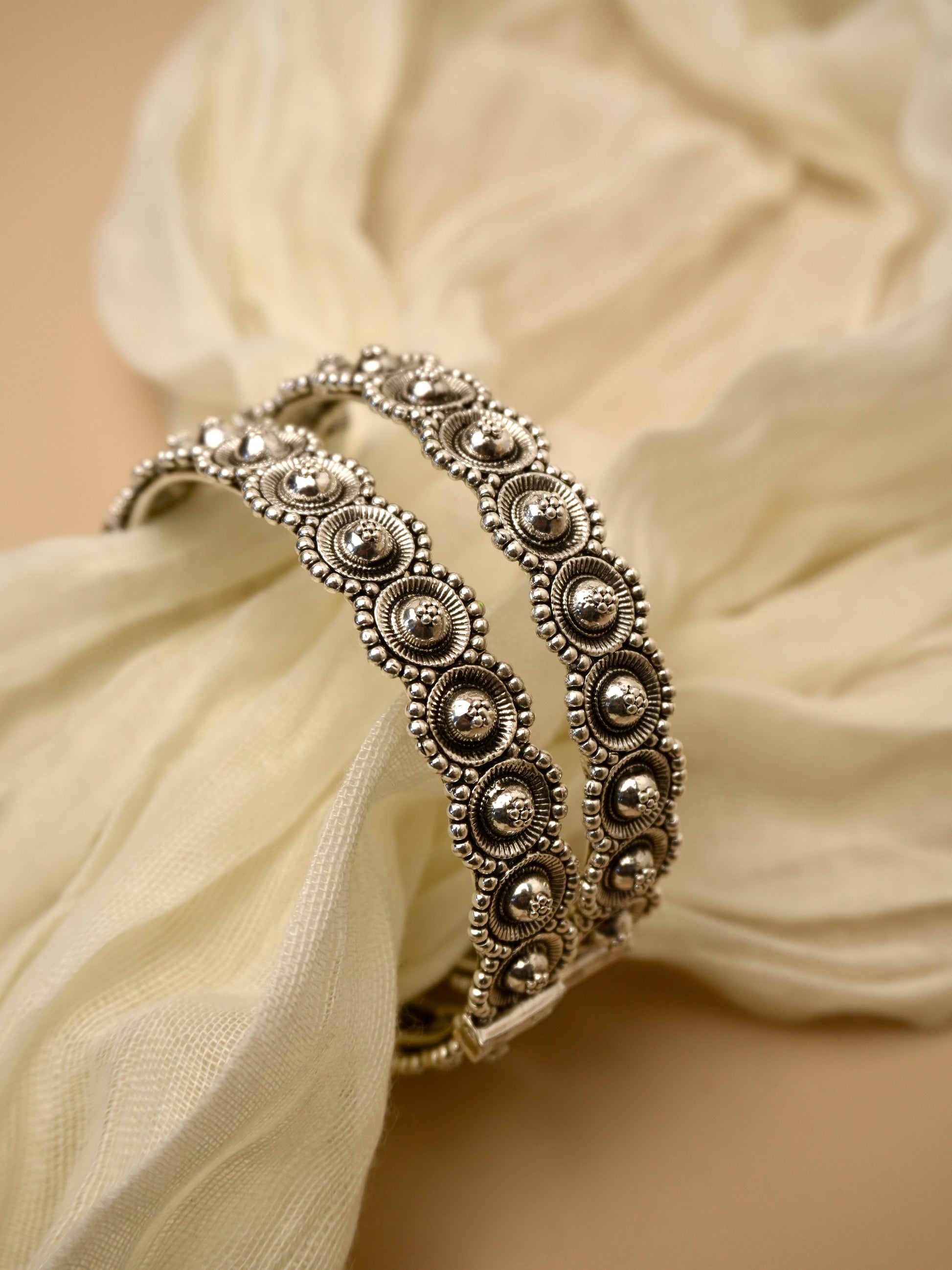 The oxidised finish enhances the artisanal details, making them easy to pair with both traditional and contemporary outfits. These bangles are crafted to transition effortlessly, whether you’re dressing for nine nights of garba or curating everyday looks that carry the same cultural influence.
