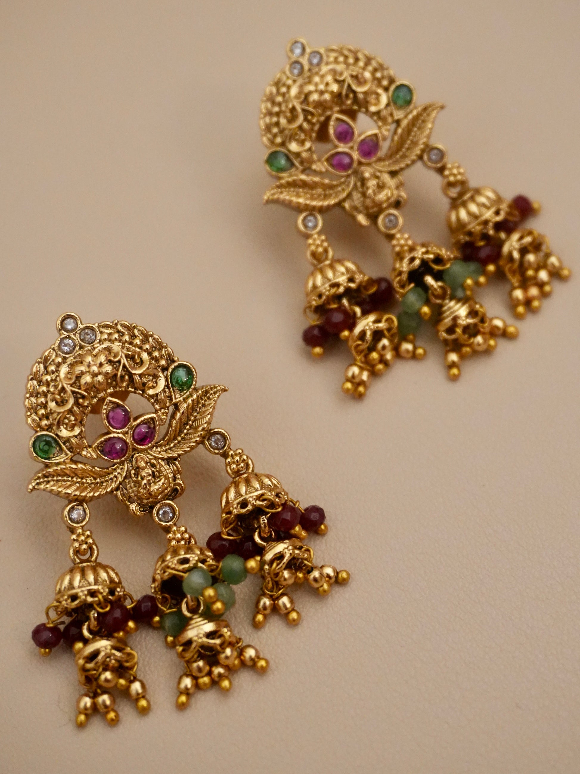 Transform your look into one of royalty with our Geetika Earrings. An old world gold design, inspired by temple jewellery, adds a regal touch to your look. The dainty size and antique design make for a unique and elegant accent to any outfit.
