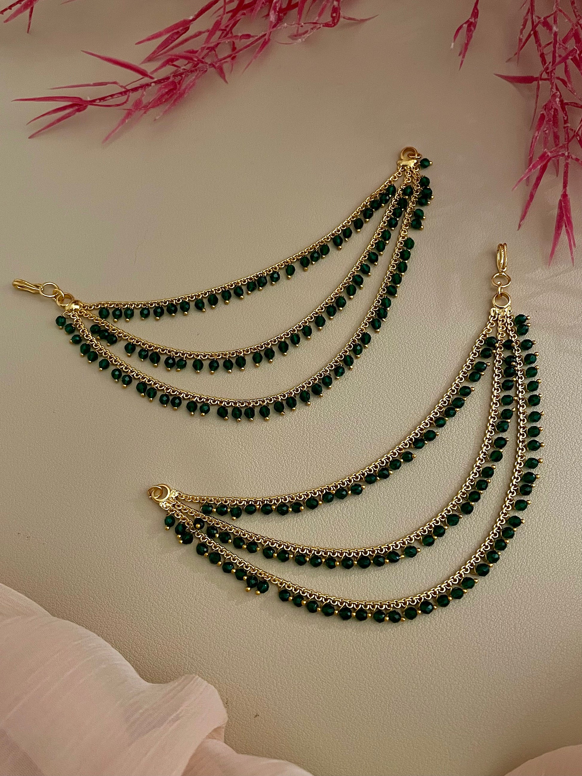 Introducing the Hiranya Ear Chains, a must-have accessory for the bride or sister of the groom. This exquisite 3-layered chain is embellished with stunning emerald beads, sure to catch the eyes of all.