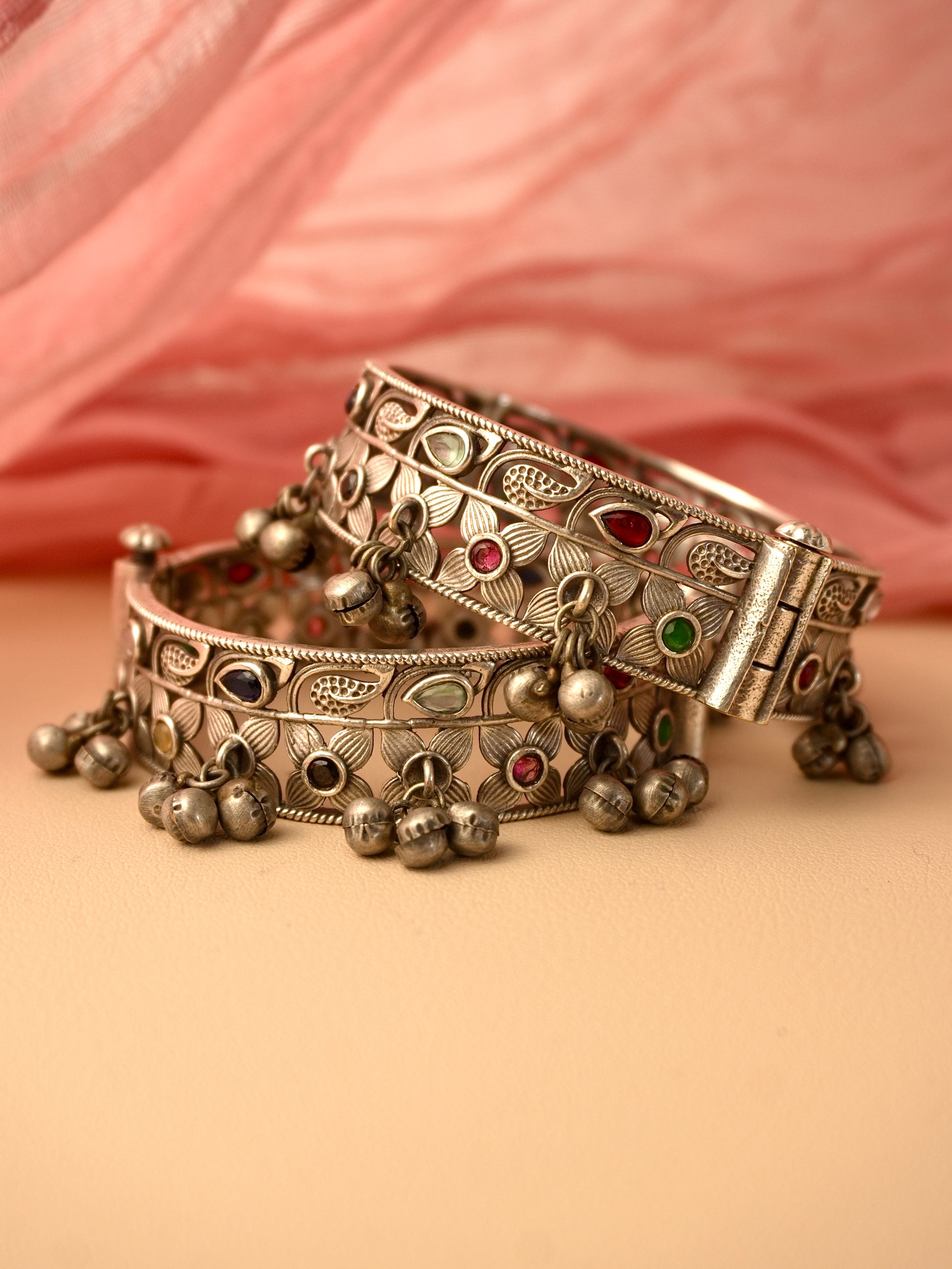 The oxidised finish enhances the artisanal details, making them easy to pair with both traditional and contemporary outfits. These bangles are crafted to transition effortlessly, whether you’re dressing for nine nights of garba or curating everyday looks that carry the same cultural influence.