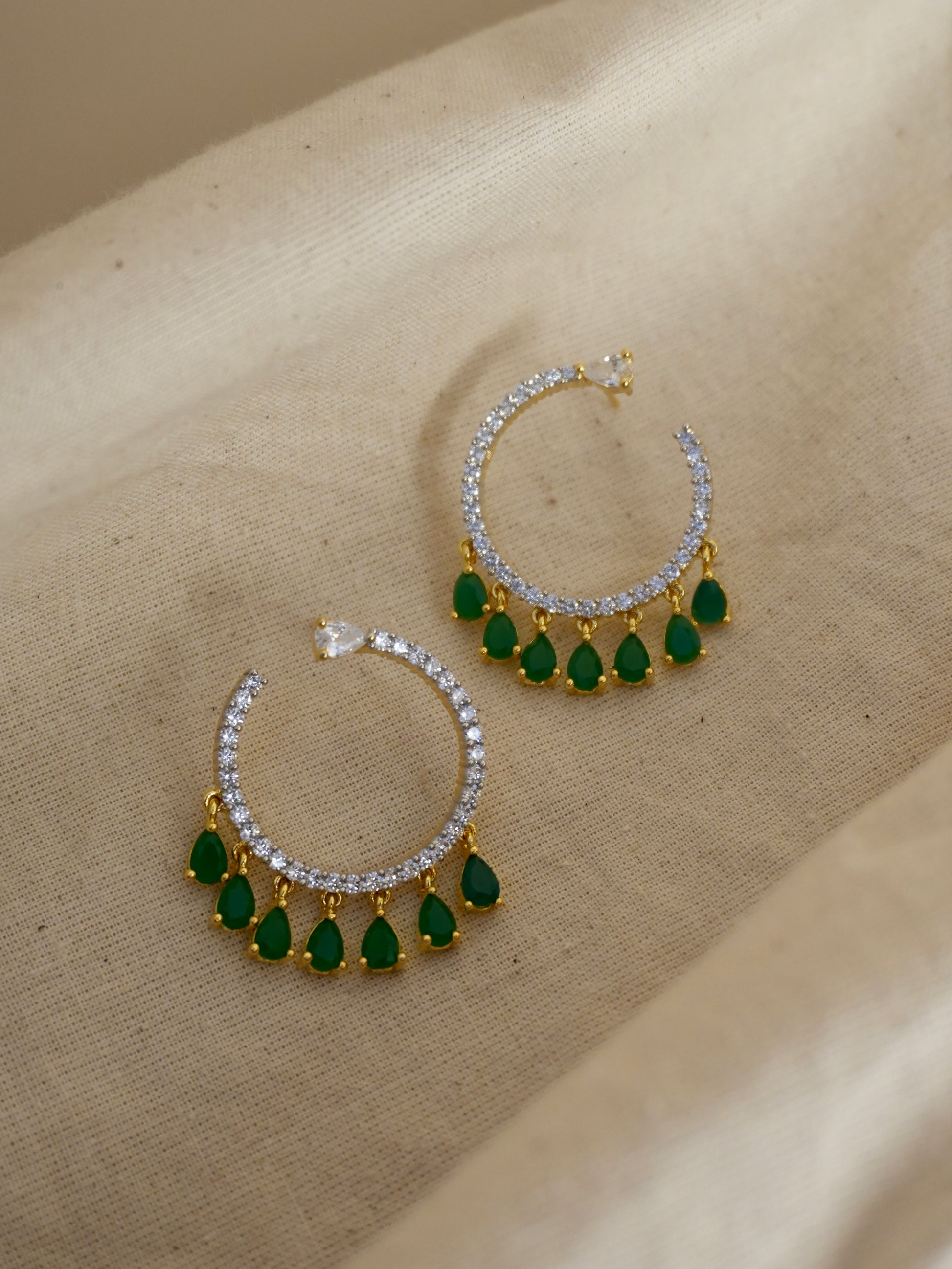 Elevate your style with Amiya Earrings. Minimal yet impactful, these earrings feature sparkling faux diamonds that guarantee shine and sparkle. The deep emerald green pear drops and modern chandbali design add a touch of sophistication. Experience luxury in every wear.