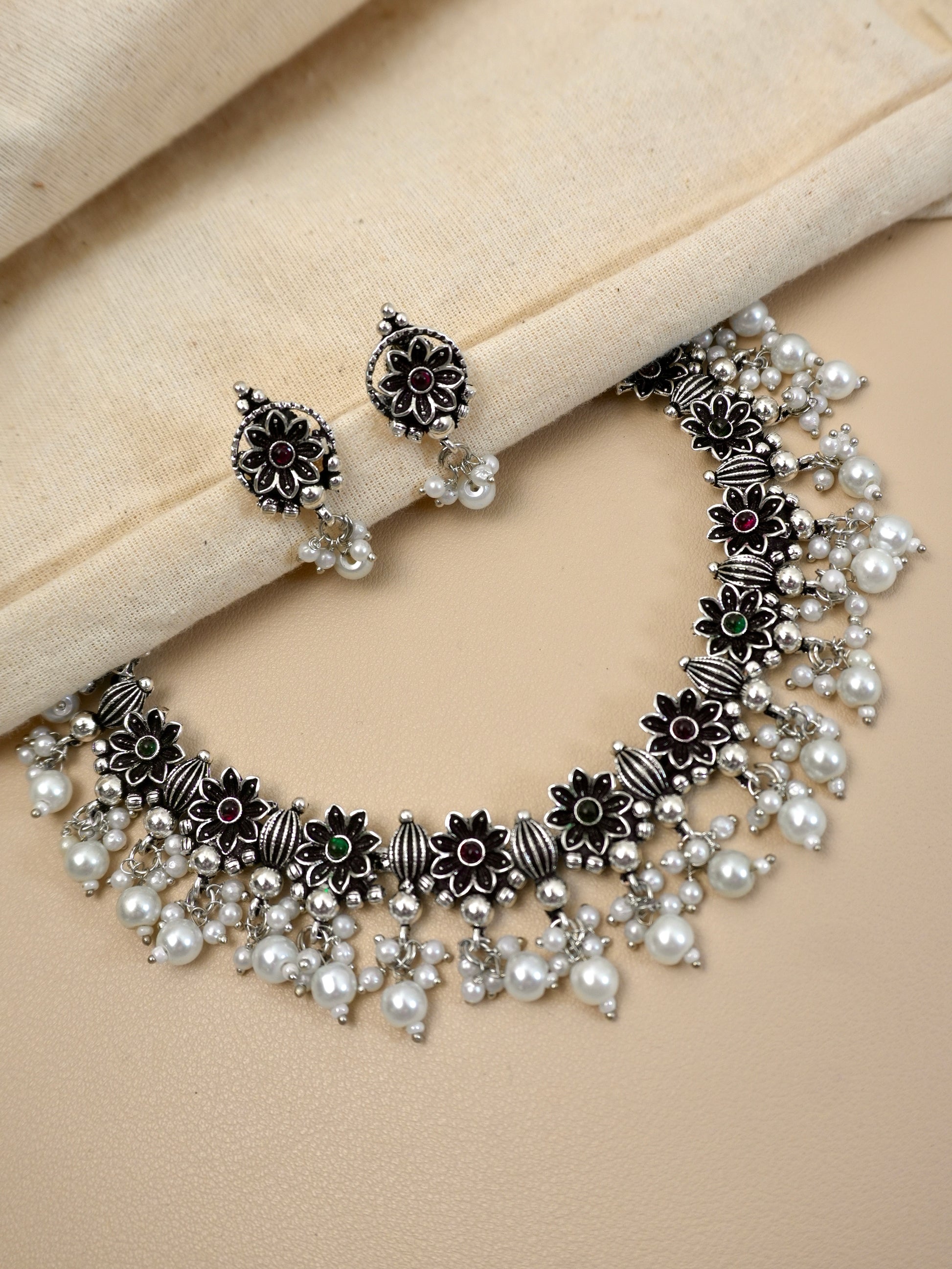 The Maanasa Oxidised Necklace Set is perfect for girls who love delicate and dainty jewellery. This simple, lightweight necklace set effortlessly blends elegance with everyday charm. Wear it solo or layer it for a cute, understated statement.