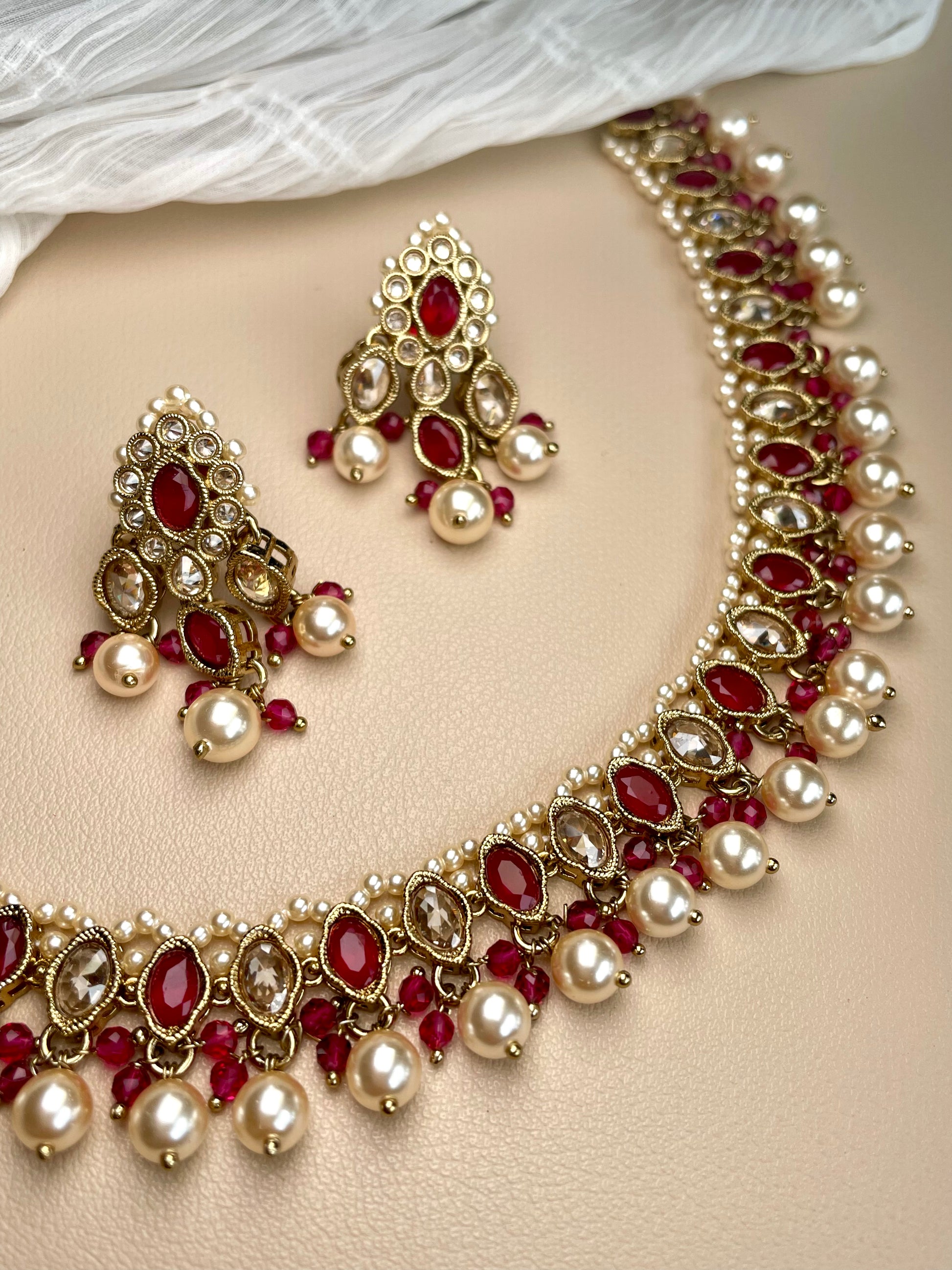 Introducing the Mirai Necklace Set - beautifully delicate and dainty, adorned with carmine coloured stones & lustrous pearls.