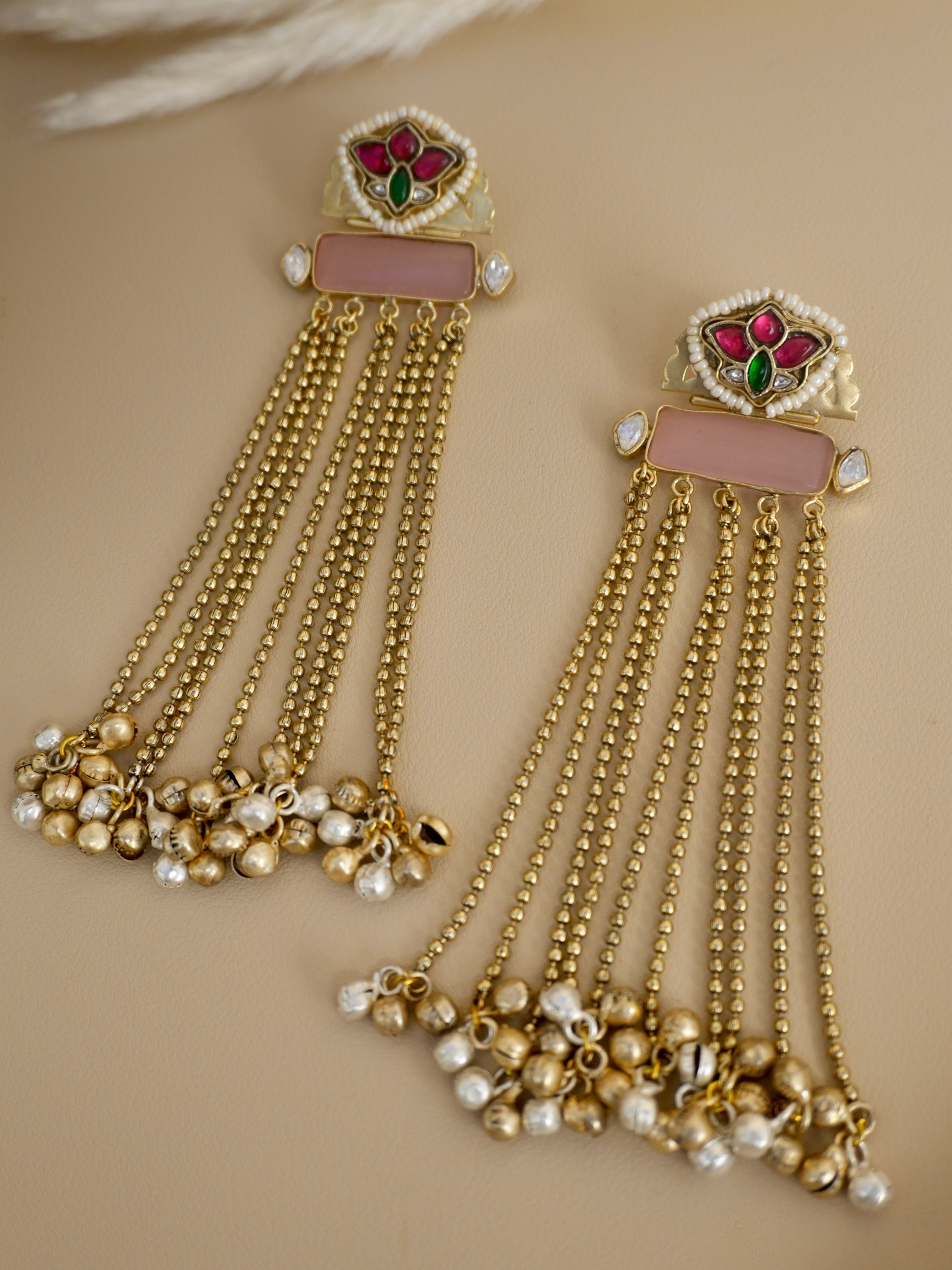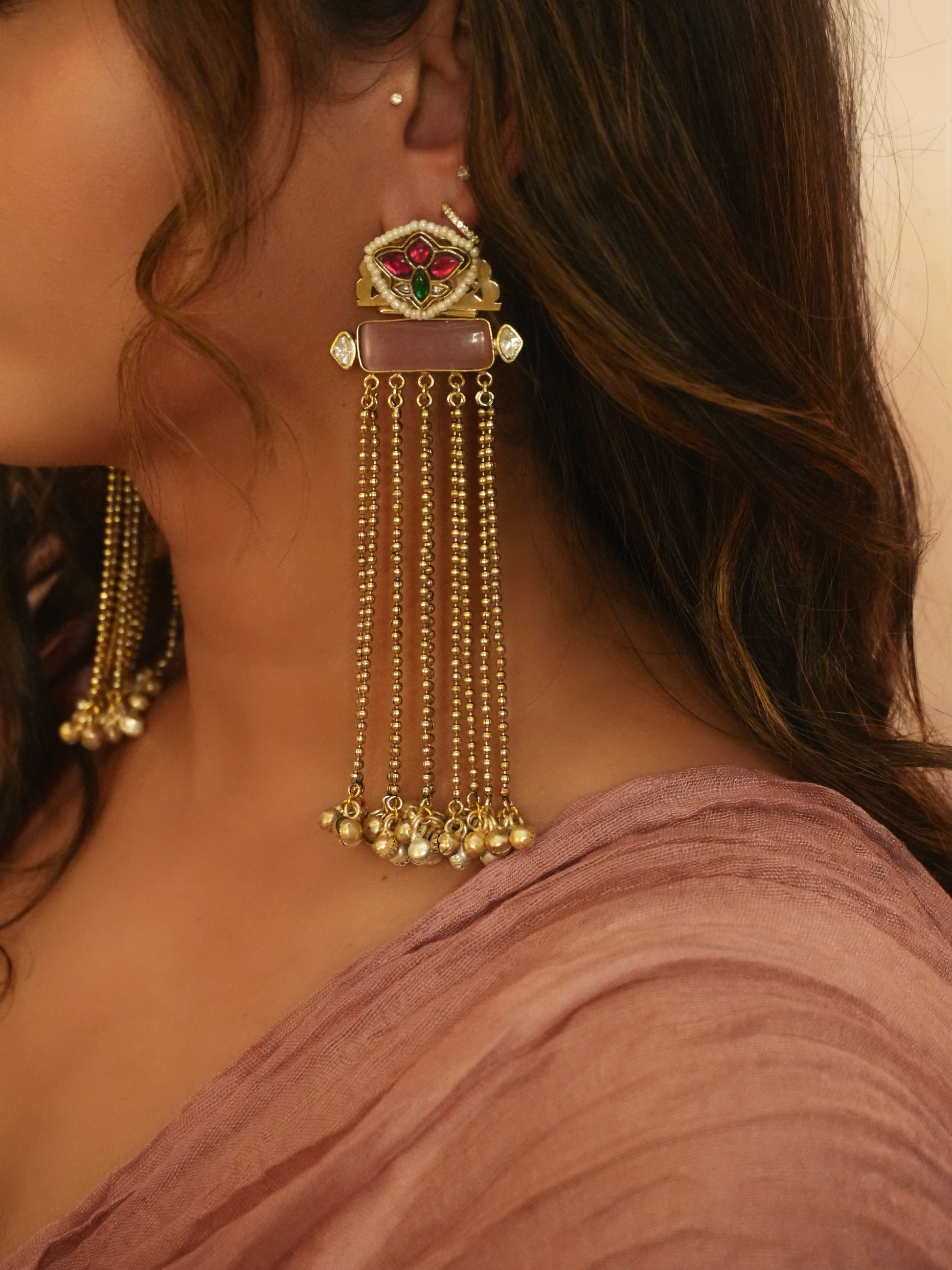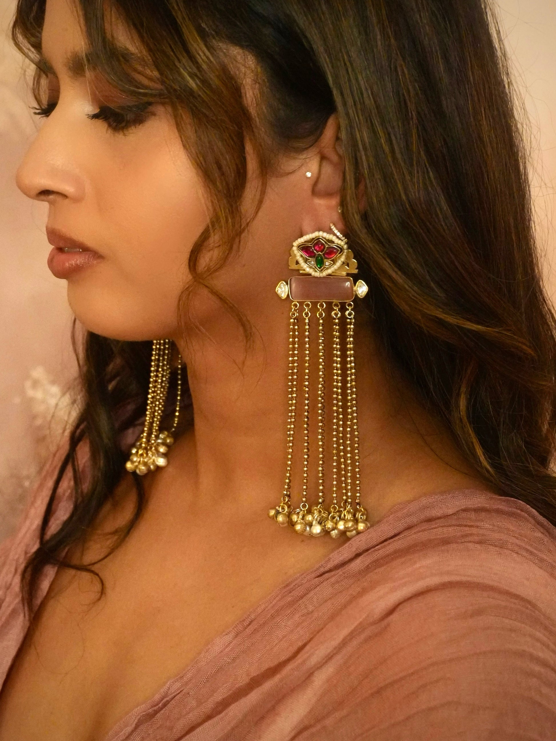 Add a touch of boho chic to your style with Mishika Oxidised Earrings. These oversized earrings boast a fusion of oxidised and traditional gold jewellery, complete with two-tone metal details and ghungroo bells for a fun, tribal vibe. Perfect for the free-spirited desi girls.