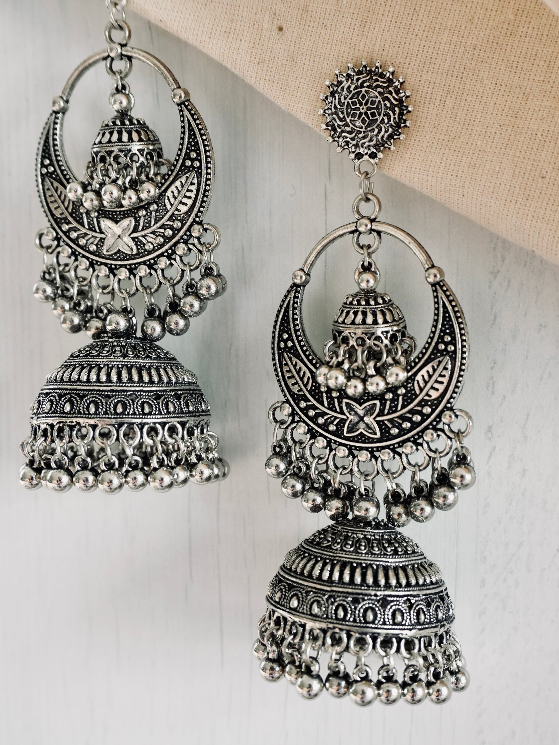 Stand out with the Namrata Jhumka Earrings - oversized and crafted in oxidised silver, these statement earrings are beautifully detailed to make a perfect addition to any traditional outfit.