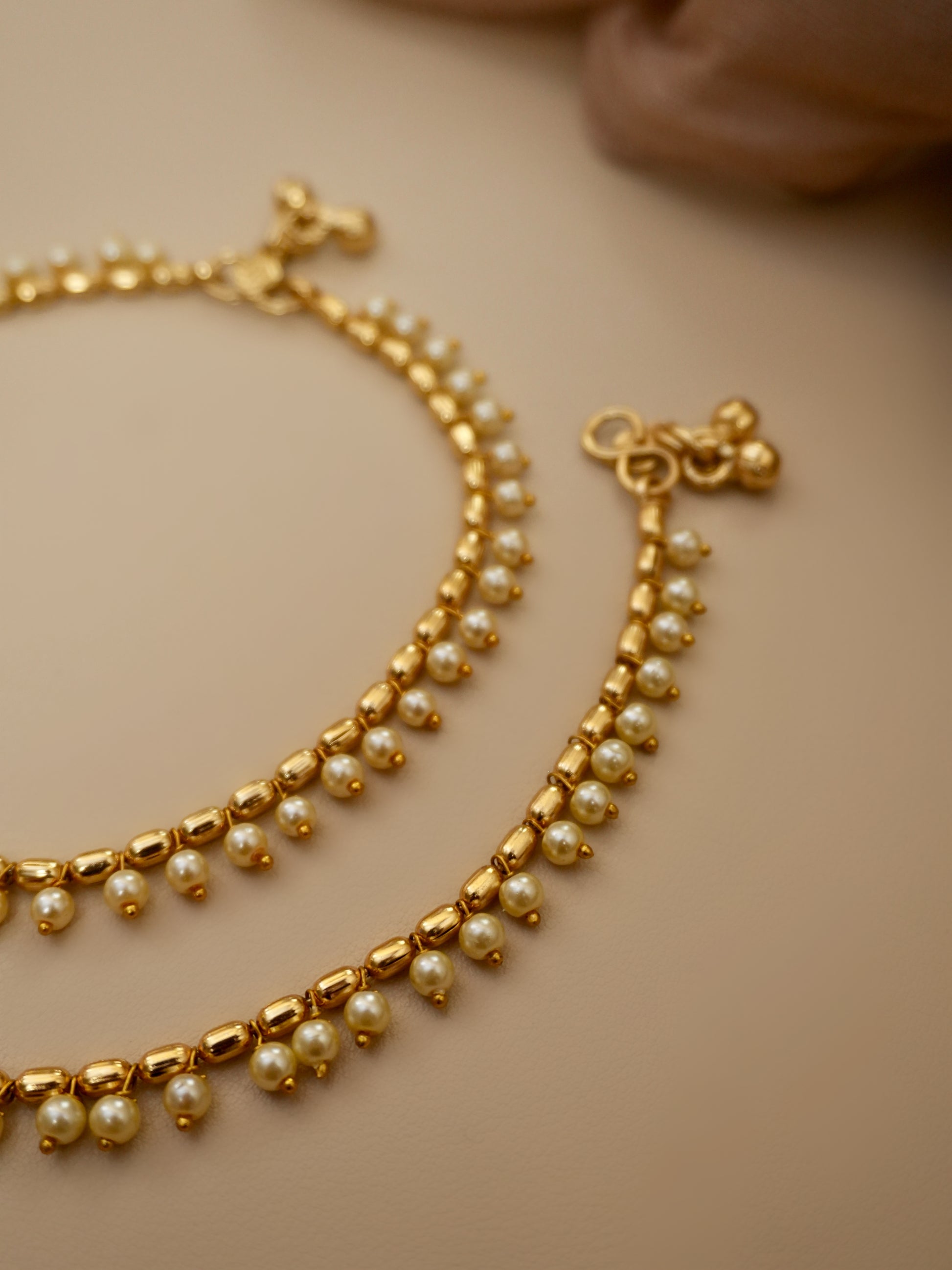 Introducing Pahel Payal - simple and elegant gold plated beaded payals with pearls. Its ornate and classic design make it the perfect accessory for the modern desi girl.