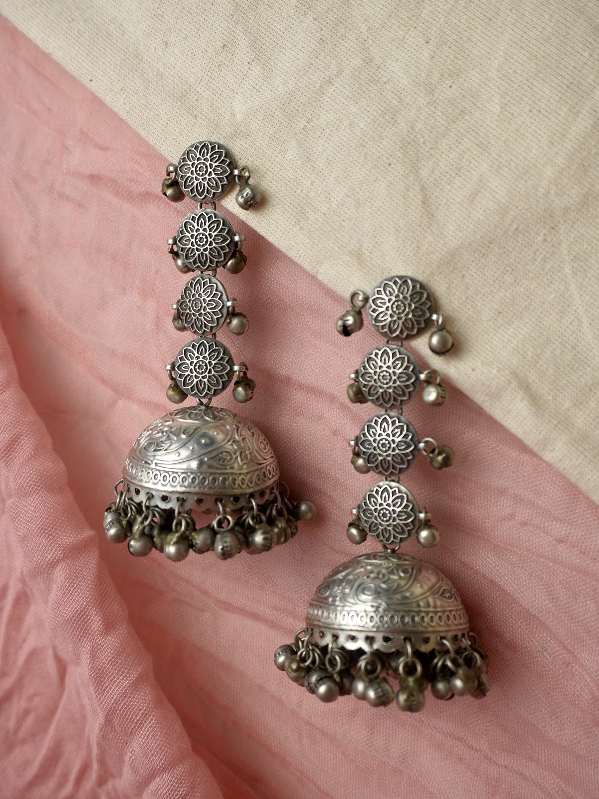 Celebrate Navratri in style with the Radhika Oxidised Earrings. These oversized jhumkas bring a bold tribal vibe, making every twirl a statement. Adorned with charming ghungroo bells, they add a playful jingle to your festive dance moves.
