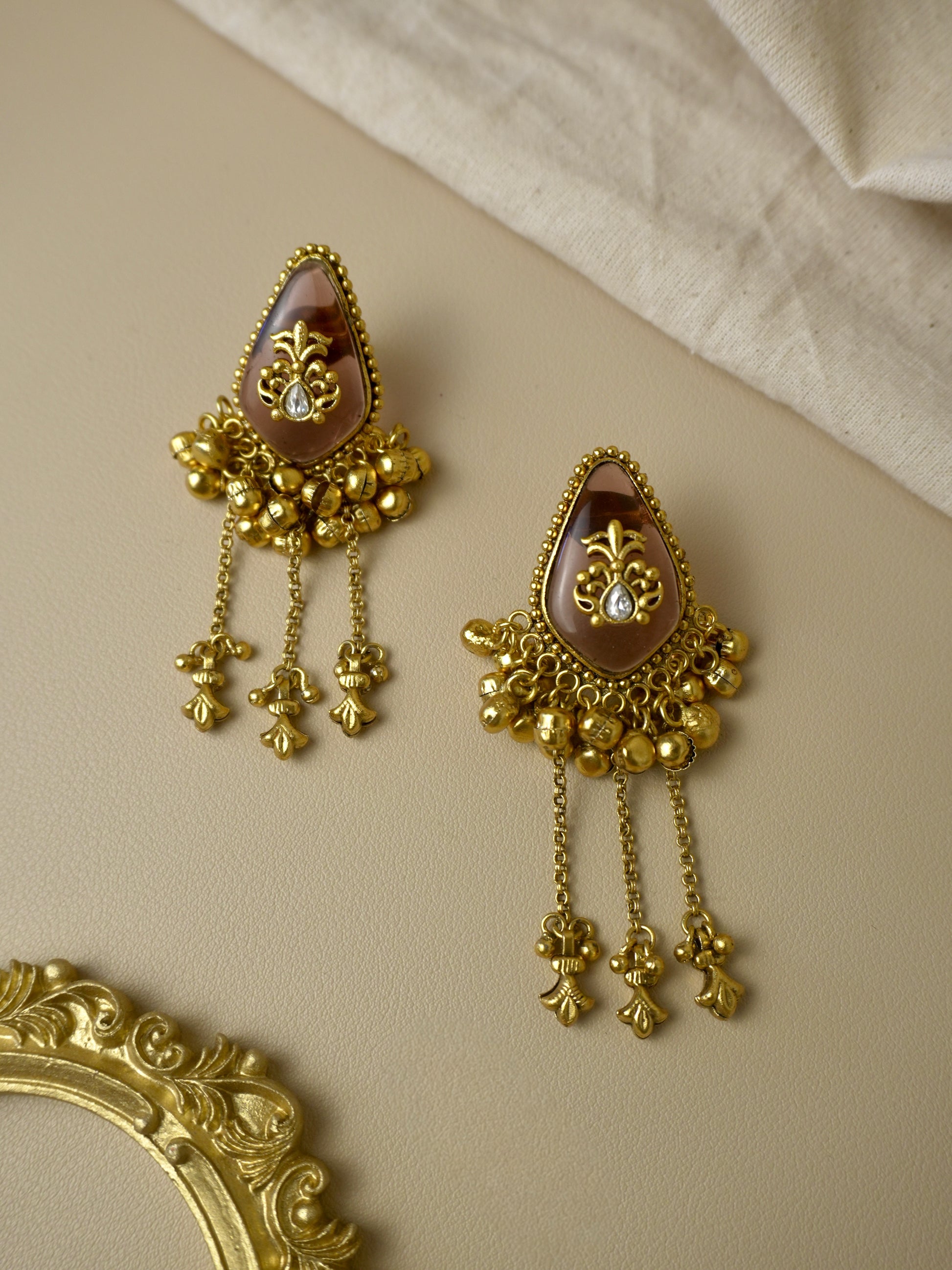 The Rashi Earrings combine small gold ghungroo bells with vibrant purple traditional resin work for a look that’s uniquely bold and full of personality. Lightweight and lively, they add a playful jingle to your style while being comfy enough to dance all night long. Perfect for those who love to stand out with a fun, cultural twist.