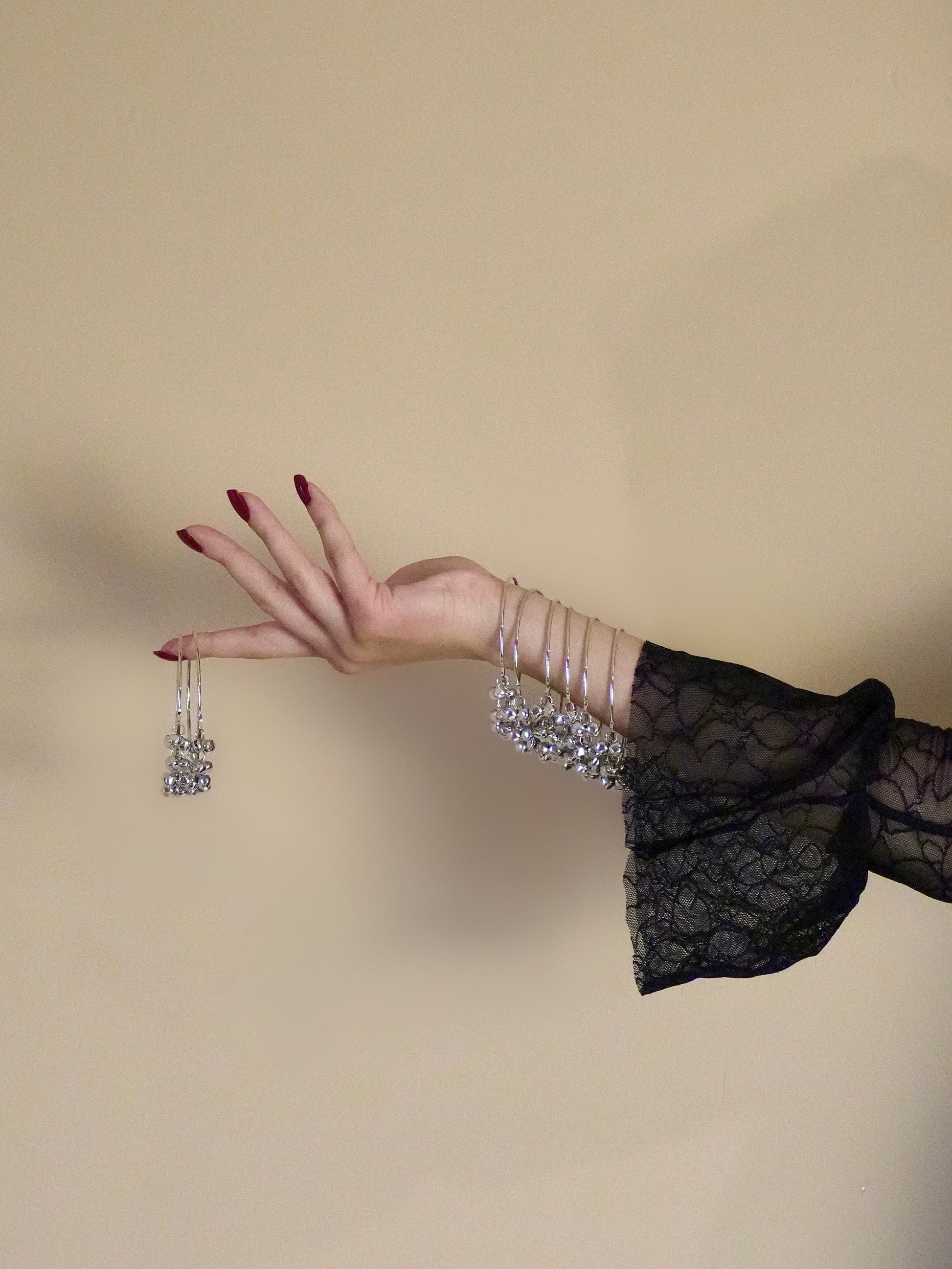 A simpler take on our bestselling Laya Bangles, classic silver, sleek on top, with just enough ghungroo bells at the bottom. Minimal, versatile, and made to pair effortlessly with your western fits.