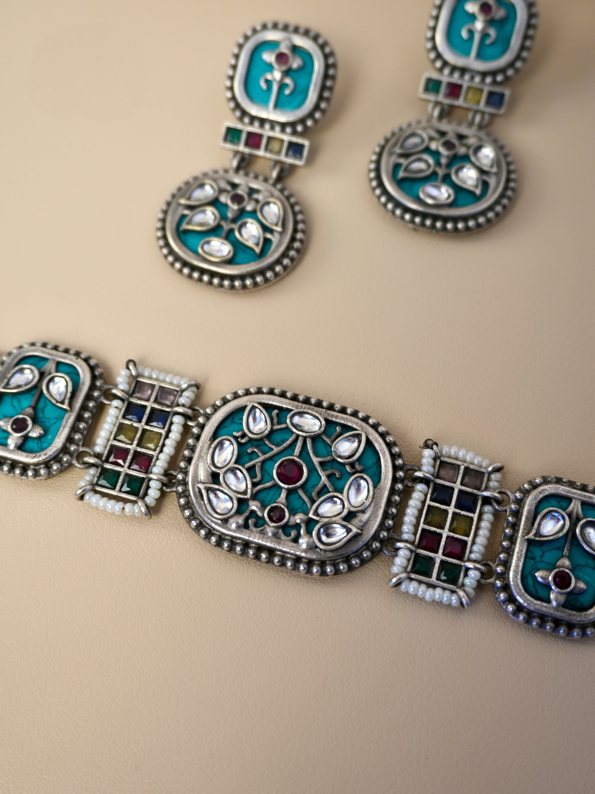 Achieve the ultimate level of boho chic with the Disha Oxidised Choker Set. The perfect combination of turquoise and silver creates a match made in heaven. The unique choker style, paired with stunning drop earrings, will elevate any outfit to a luxurious level.