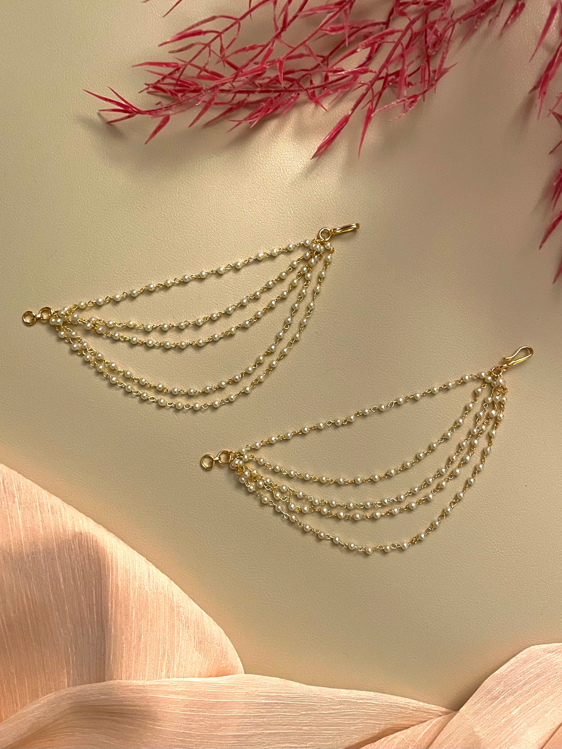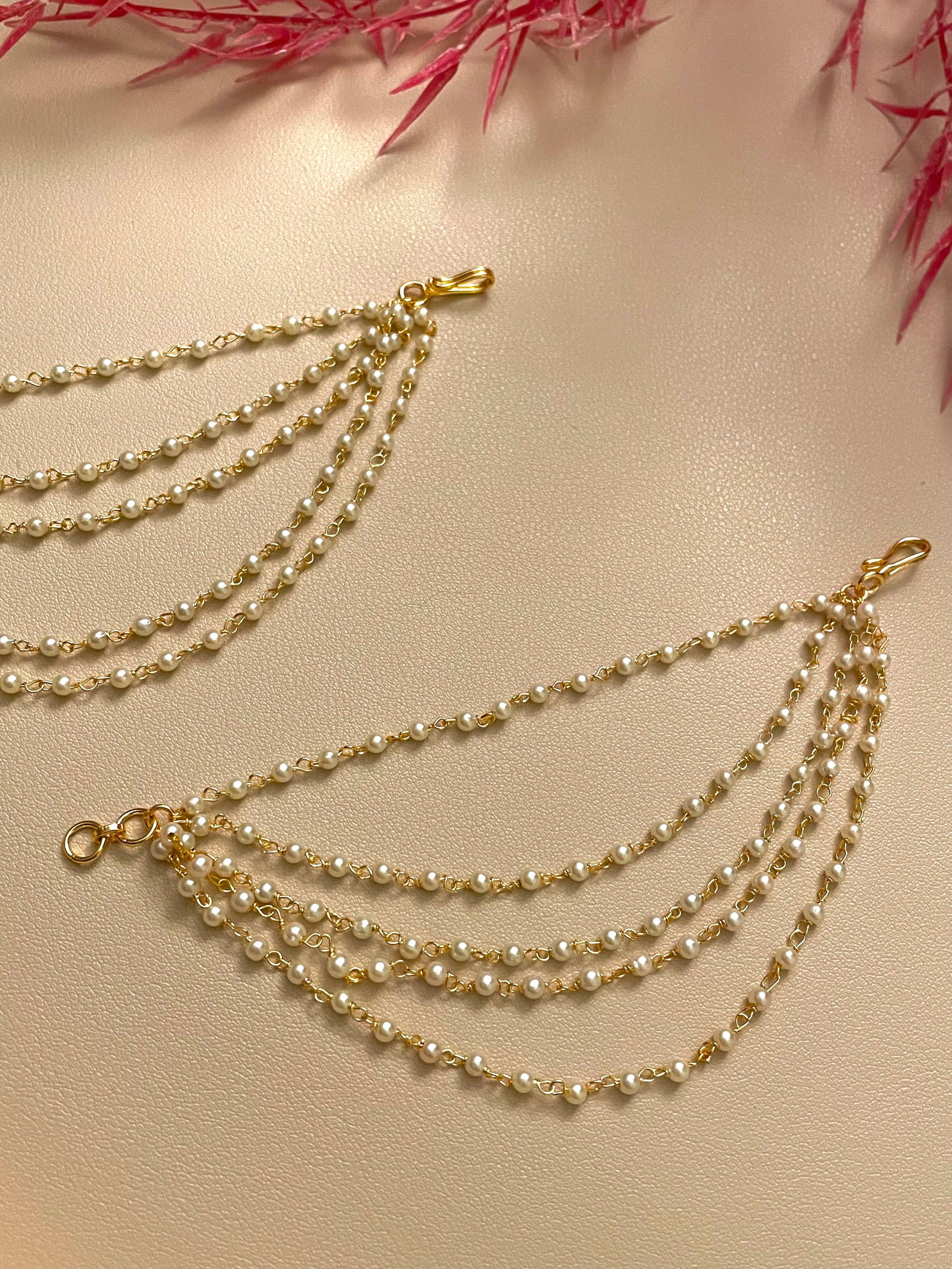 Upgrade your earring game with the Sukanya Ear Chain. This 5 layer pearl beaded chain adds a touch of elegance and makes any pair of earrings stand out. Perfect for those who want to make a statement with their accessories.