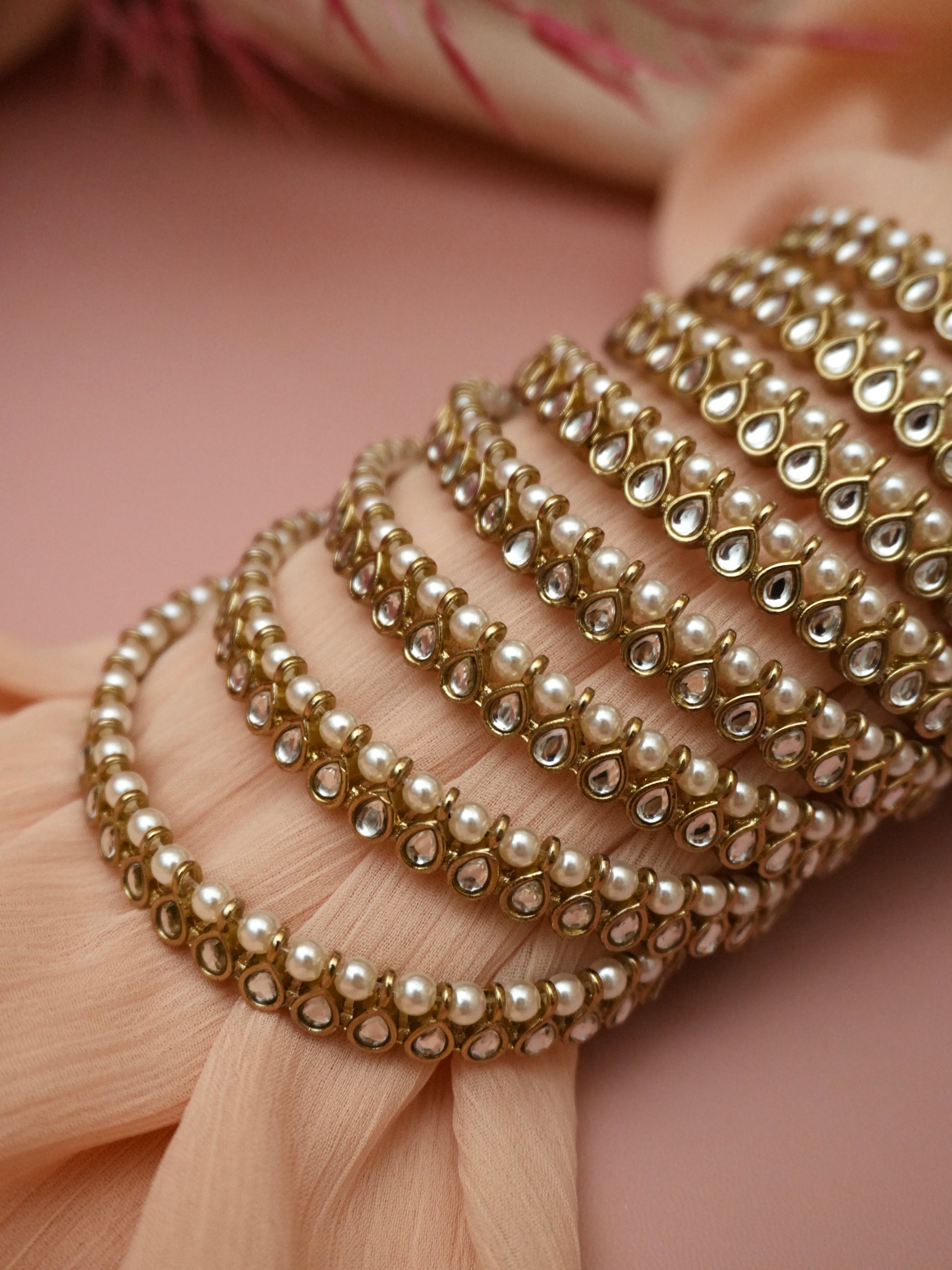 Accessorise your look with the Tara Bangles. Crafted with pearl beads, antique plating and champagne coloured stones, these bangles are perfect for any special occasion.