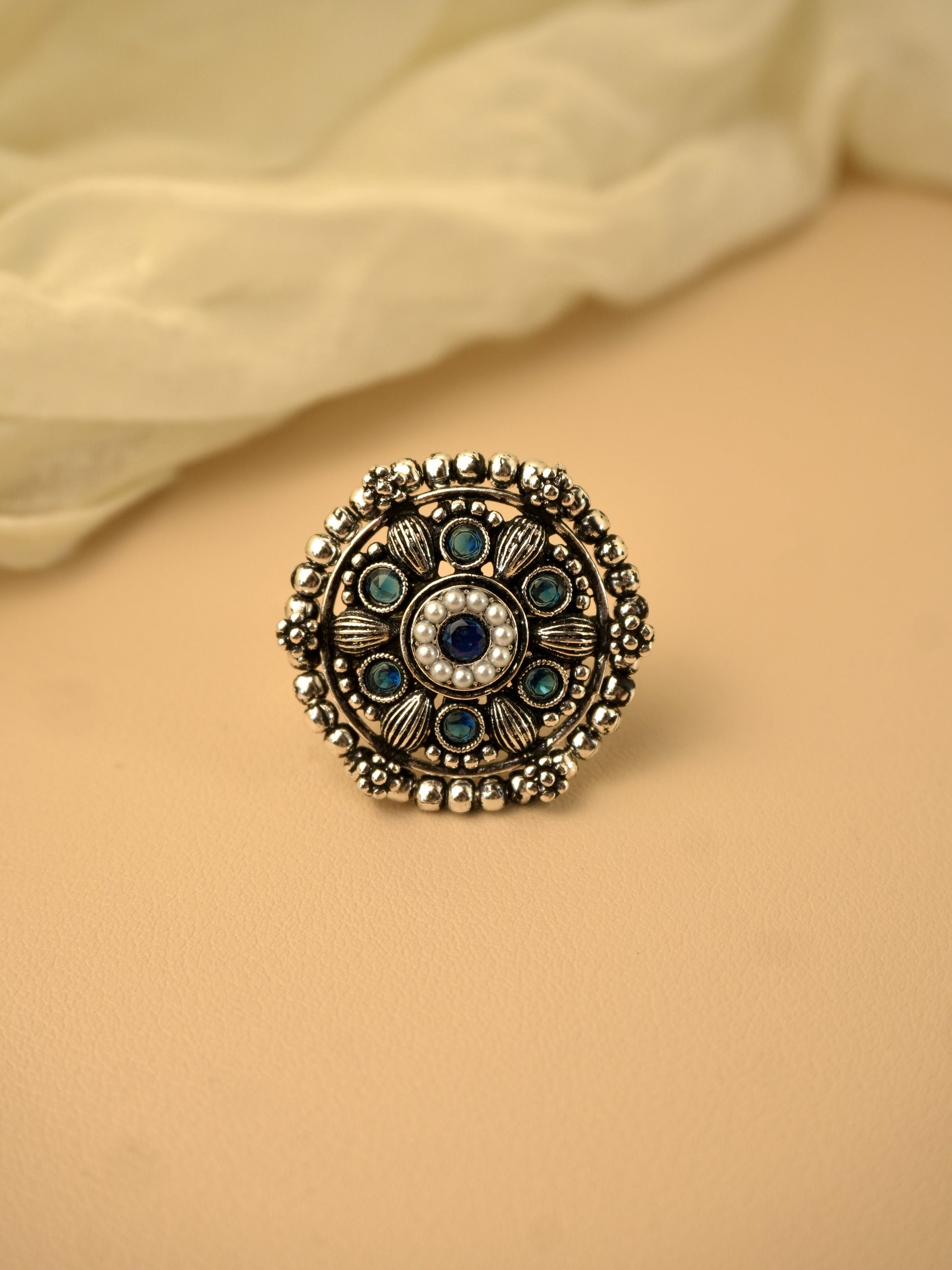 The Urmila Oxidised Ring is the perfect staple piece for your oxidised jewellery collection. Its detailed design adds a beautiful touch to any look. Crafted from high-grade metals, the Urmila Ring is sure to become an instant favourite.